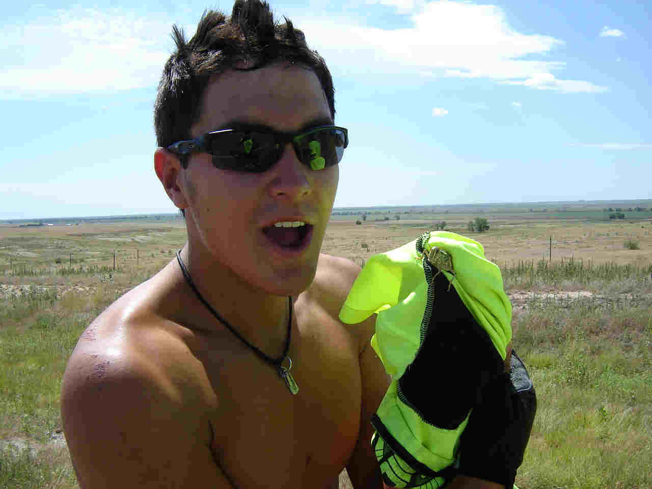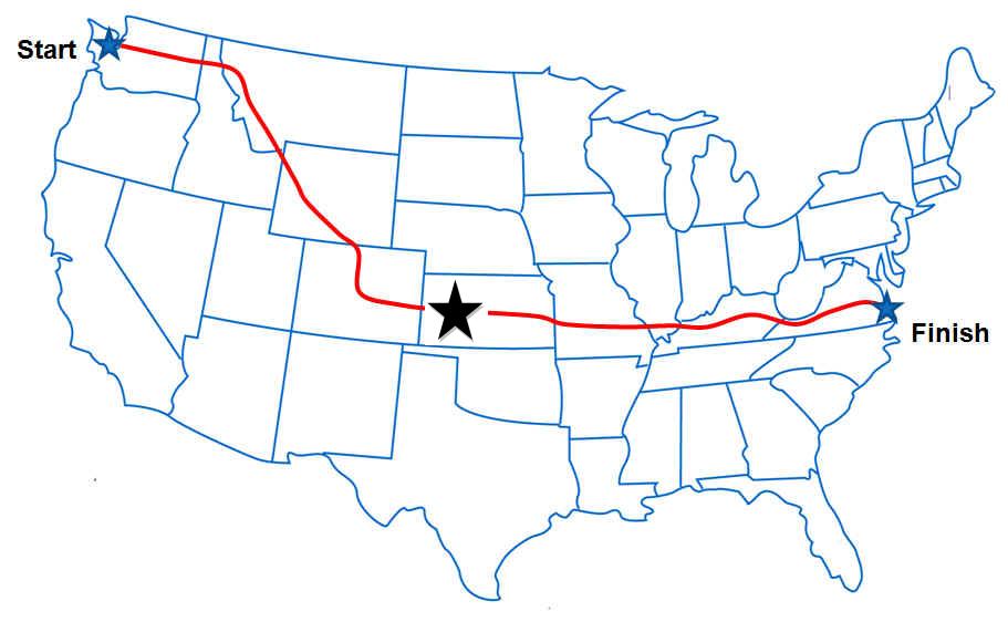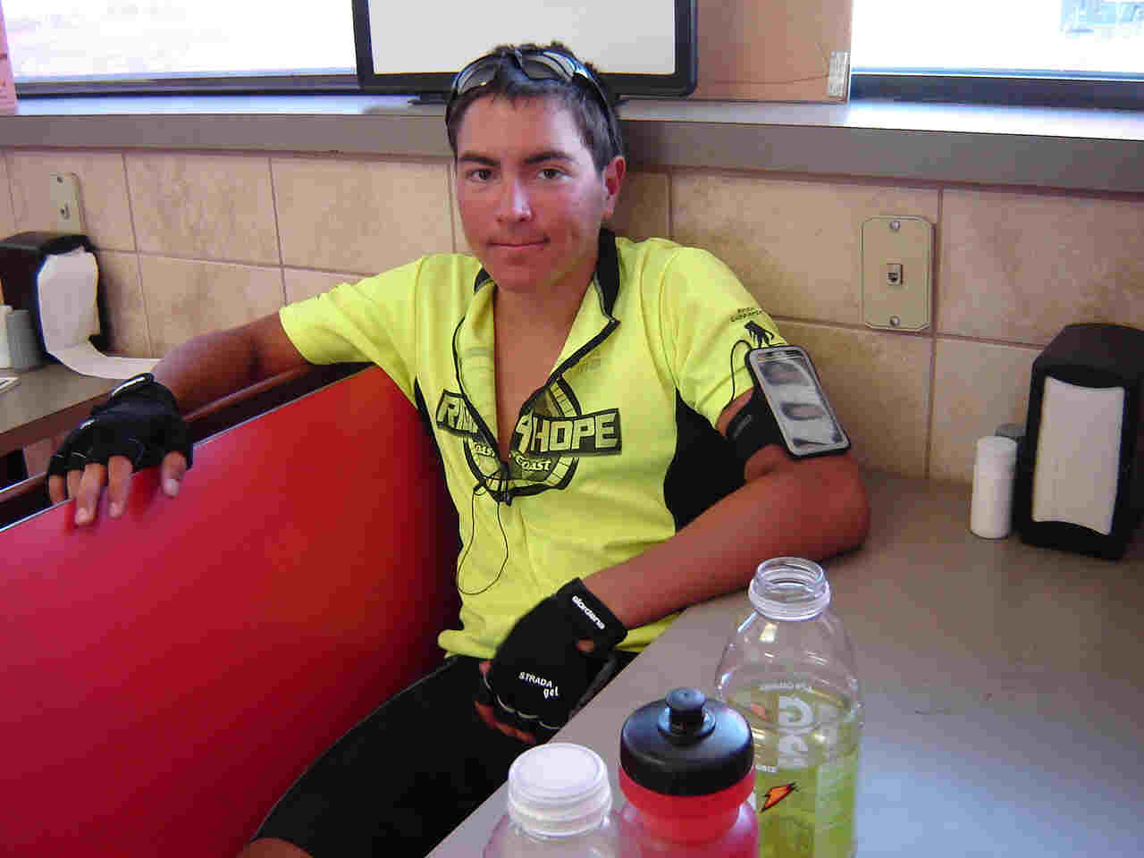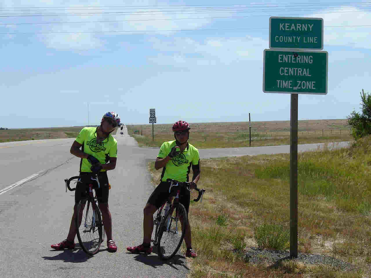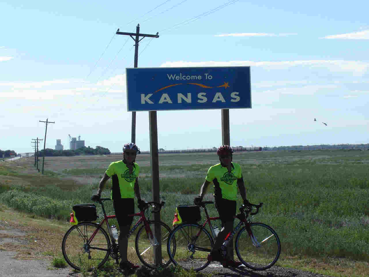 Kansas. For us it was very apparent; we Since we were riding 150 miles today we planned stops at 50 and 100 miles for lunch/snacks. We arrived at our first stop but Skip was not to be found. Turned out he went the wrong direction out of the hotel and was slightly delayed. (And I even called him and left a message on his phone to give him a head's up.) We stopped for lunch at the 75 mile point. By then the heat was really getting up there and the wind was now a head wind. The boys were beat. We had lunch and then just relaxed (ie cat nap). While we were there we conducted a phone interview with Mandy of the Kitsap Sun. They wanted to do a follow-up article on how we were doing on our trip. It should come out sometime this week. We are officially at the half way point and have traveled 1,967 miles!!